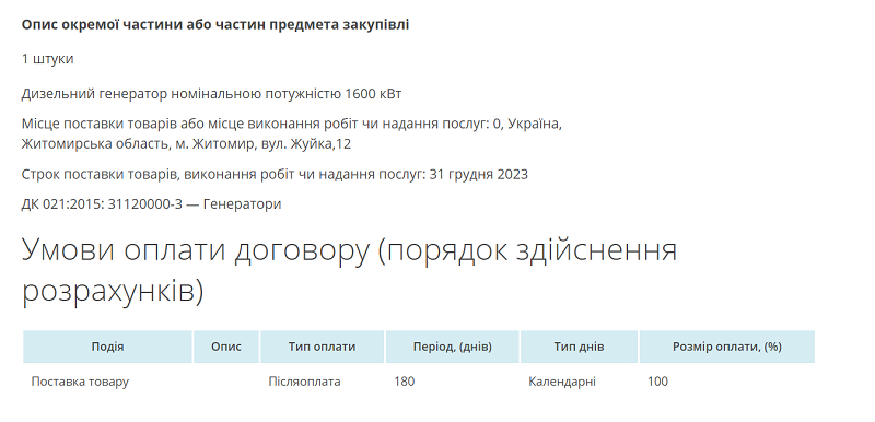 Так, відповідно до інформації на ресурсі «Prozorro», предметом закупівлі є дизельний генератор номінальною потужністю 1600 кВт. Строк поставки товару – 31 грудня 2023 року. Очікувана вартість – 8 497 627 грн.
