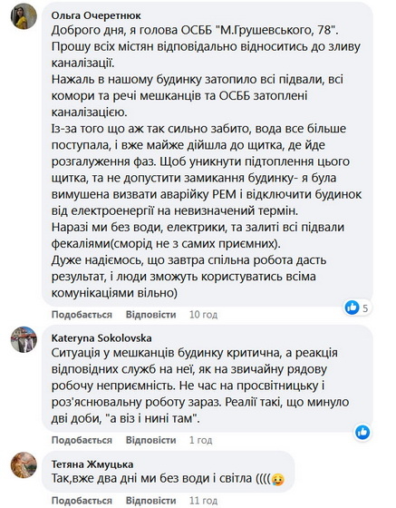 «На жаль в нашому будинку затопило всі підвали, всі комори та речі мешканців та ОСББ затоплені каналізацією. Із-за того що аж так сильно забито, вода все більше поступала, і вже майже дійшла до щитка, де йде розгалуження фаз. Щоб уникнути підтоплення цього щитка, та не допустити замикання будинку я була вимушена визвати аварійку РЕМ і відключити будинок від електроенергії на невизначений термін. Наразі ми без води, електрики, та залиті всі підвали фекаліями(сморід не з самих приємних)», - зазначає голова ОСББ.