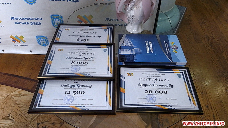 Мер Житомира вручив грошові сертифікати за спортивні здобутки тренеру з таеквондо та трьом призерам міжнародних змагань.