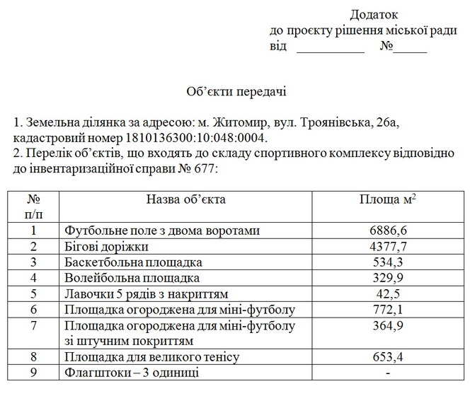 «Надати згоду на прийняття із державної власності у комунальну власність Житомирської міської територіальної громади спортивного комплексу разом із земельною ділянкою, на якій він розташований, за адресою: м. Житомир, вул. Троянівська, 26а згідно з додатком, та перебуває у сфері управління Державної служби України з надзвичайних ситуацій за умови використання за цільовим призначенням і не відчужувати його в приватну власність», - йдеться у проєкті рішення.