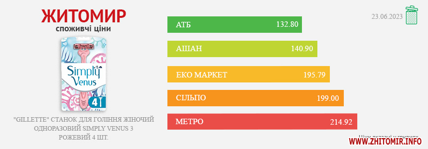 Моніторинг здійснено на основі інформації, отриманої за методом контрольної закупки 23.06.2023 р. у місцях продажу: АТБ, пр. Миру, 15 А, Ашан, вул. Київська, 77, Метро, вул. Ватутіна, 55-в, Сільпо, пл. Житній ринок, 1, Еко Маркет, вул. Мала Бердичівська, 2/7