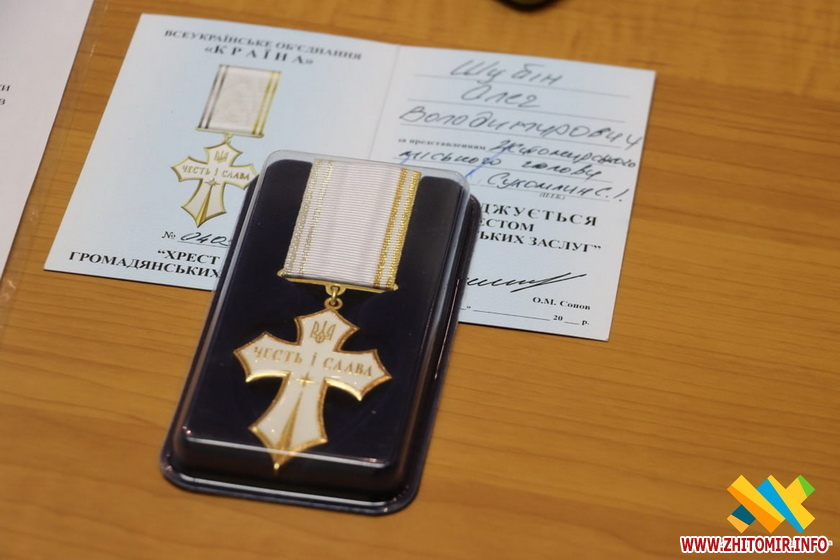 Нагороду отримав і Олег Шубін – хірург, командир медичної роти, який щодня рятує життя військовим. Йому вручили знак народної пошани «Хрест громадських заслуг». Ця нагорода – це щира подяка цивільним від військових, втілена в металі. Її автором є Олександр Сопов, голова ВГО «Країна», автор 14 знаків державних нагород України.