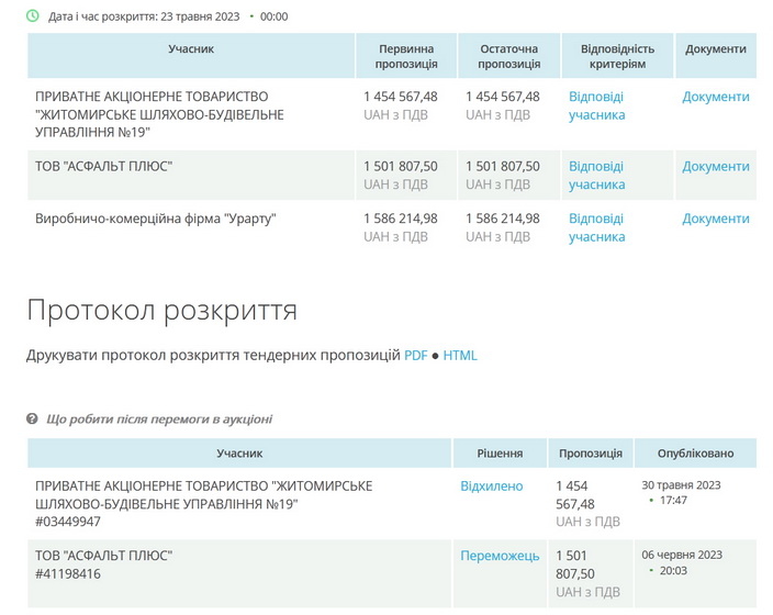 Початкова вартість закупівлі становила 1 млн 972 тис. 393,20 грн, на торги подали заявки три фірми: ПрАТ «Житомирське шляхово-будівельне управління №19» - 1 млн 454 тис. 567,48 грн; ТОВ «Асфальт Плюс» - 1 млн 501 тис. 807,50 грн; виробничо-комерційна фірма «Урарту» - 1 млн 586 тис. 214,98 грн.
