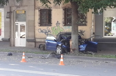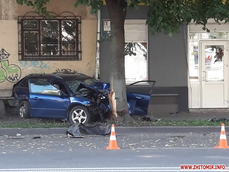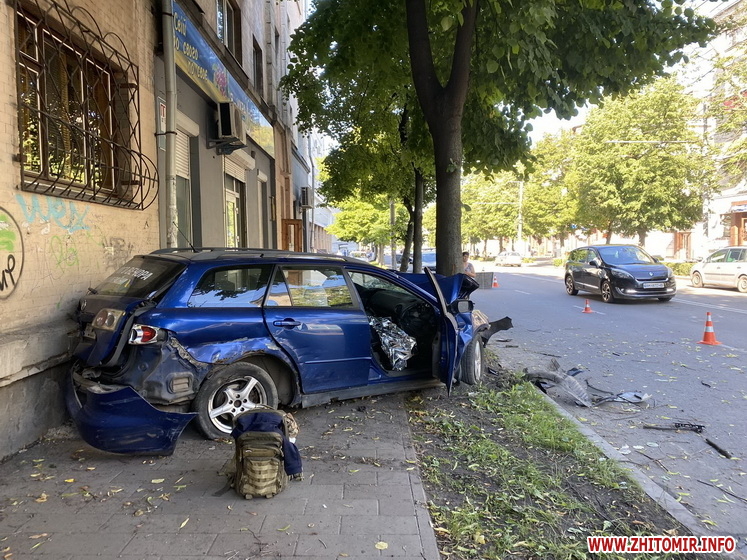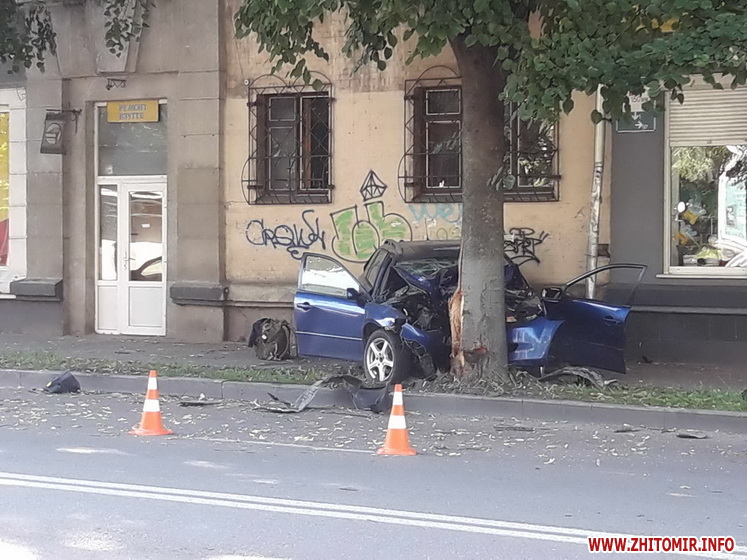 В Житомирі на вулиці Київській вранці 10 липня сталася дорожня транспортна пригода, в результаті якої автомобіль вилетів та тротуар та врізався в дерево.