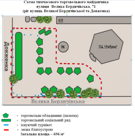 Нагадаємо, після офіційного створення в жовтні 2016 року так званих «соціальних ринків», були нарікання на майданчик на розі вулиць Великої Бердичівської та Довженка: 22 грудня 2016 року члени виконкому говорили про порушення санітарних норм на цьому тимчасовому торговельному майданчику та обурювалися, що під виглядом сільгосппродукції там продають рибу, одяг та засоби для прання; в червні 2017 року заступник мера відповідав на петицію щодо знесення палаток та заборони торгівлі на тротуарах перехрестя Велика Бердичівська – Довженка.
