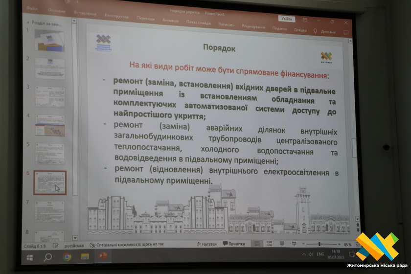 Як повідомляв Житомир.info, 6 червня 2023 року на позачерговій сесії міськради з бюджету міста виділили 5 млн грн на поліпшення стану укриттів у Житомирі. 30 червня виконком затвердив порядок проведення поточного ремонту в найпростіших укриттях в багатоквартирних будинках.