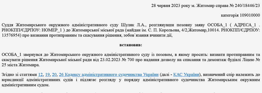 «ОСОБА_1 звернувся до Житомирського окружного адміністративного суду із позовом, в якому просить: визнати протиправним та скасувати рішення Житомирської міської ради від 23.02.2023 №700 про надання дозволу на списання та демонтаж будівлі Ліцею № 25 міста Житомира», - зазначається в ухвалі.