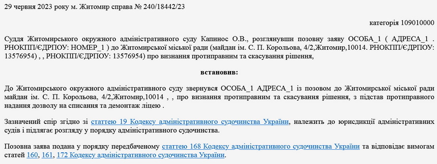 «До Житомирського окружного адміністративного суду звернувся ОСОБА_1 із позовом до Житомирської міської ради майдан про визнання протиправним та скасування рішення, з підстав протиправного надання дозволу на списання та демонтаж ліцею», - зазначається в ухвалі.