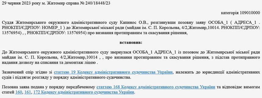 «До Житомирського окружного адміністративного суду звернулася ОСОБА_1 із позовом до Житомирської міської ради про визнання протиправним та скасування рішення, з підстав протиправного надання дозволу на списання та демонтаж ліцею», - йдеться в ухвалі.