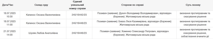Ухвалою суду від 29 червня було відкрите провадження за позовом Духніча Володимира Володимировича до Житомирської міської ради про визнання протиправним та скасування рішення.
