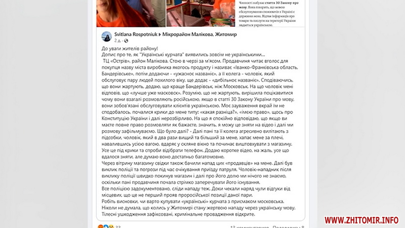 В одному з житомирських магазинів продавчиня зі своїм колегою через зауваження щодо обслуговування російською мовою накинулася на покупчиню. Остання звернулася до поліції та виклала допис у Фейсбуці, у якому розповідає про ставлення працівників магазину до українських міст та державної мови.