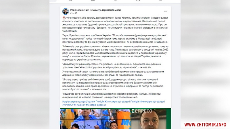 Мовний скандал прокоментував Уповноважений із захисту державної мови Тарас Кремінь. Зокрема, закликав органи місцевої влади посилити контроль за дотриманням мовного закону.
