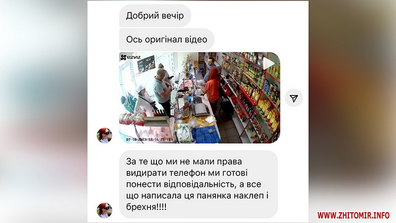 Після розголосу, редакції Житомир.info написала продавчиня того самого магазину та надіслала відео з камер відеоспостереження.