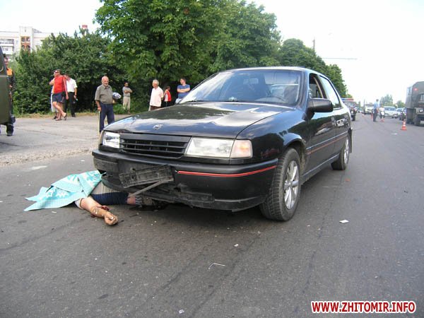 Недавно в Житомире на улице Ватутина рядом с большим супермаркетом произошло кровавое ДТП. Водитель автомобиля Фиат, сбил пешехода Житомирянина, который пересекал проездную часть, после этого пешеход вылетел на встречную полосу, где на него наехал автомобиль Опель. В результате ДТП пешеход от полученных телесных повреждений погиб на месте проишествия, сообщает пресс-служба областной ГАИ.