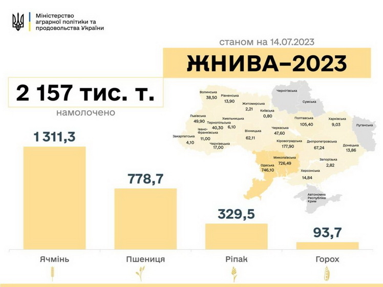 «Збір проведено на площі 643,8 тис. га при врожайності 33,6 ц/га, намолочено понад 2 млн 160 тис. тонн зерна нового врожаю в т.ч.: ячменю обмолочено 352,4 тис. га (врожайність – 38,4 ц/га), намолочено 1352 тис. тонн; пшениці обмолочено 211,8 тис. га, (врожайність – 33,7 ц/га), намолочено 714,6 тис. тонн; гороху обмолочено 44,99 тис. га (врожайність – 20,8 ц/га), намолочено 93,7 тис. тонн», - зазначається у повідомленні.
