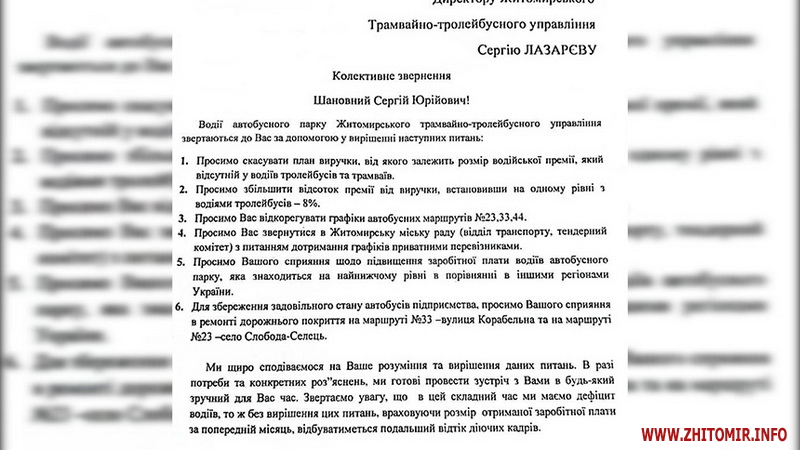 «В кінці минулого тижня водій мені повідомив, що підготували лист на керівника ТТУ, щоб вирішити деякі питання щодо заробітної плати, коригування графіків, доріг та інші питання. Про наболіле, як кажуть», – розповідає начальник автобусного парку КП «Житомирське трамвайно-тролейбусне управління» Богдан Ткач