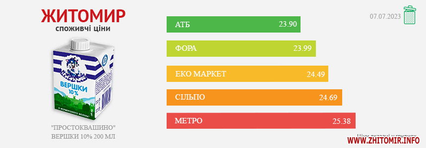 Моніторинг здійснено на основі інформації, отриманої за методом контрольної закупки 07.07.2023 р. у місцях продажу: АТБ, пр. Миру, 15 А, Фора, вул. Лятошинського, 2, Метро, вул. Ватутіна, 55-в, Сільпо, пл. Житній ринок, 1, Еко Маркет, вул. М. Бердичівська, 2/7