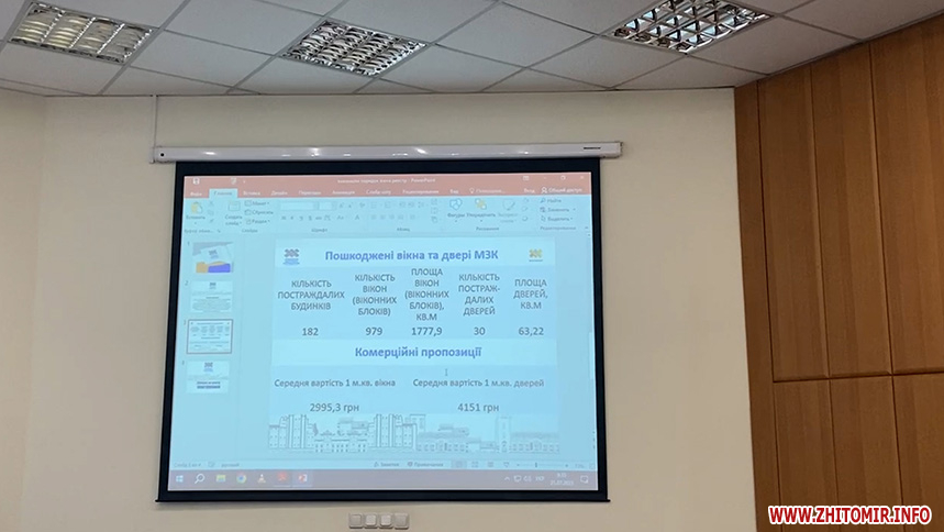 «Кількість постраждалих будинків – 182, кількість віконних блоків, які потребують заміни – 979, площа віконних блоків – 1777,9 кв.м, кількість постраждалих дверей – 30, їх площа 63,22 кв.м», - розповідає начальник управління житлового господарства Житомирської міської ради Андрій Гуменюк.