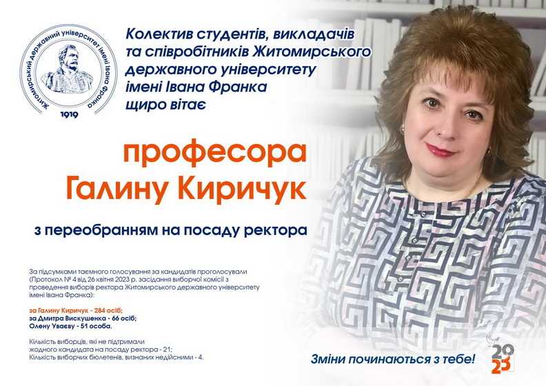 Житомирський державний університет імені Івана Франка минулого року після повномасштабного російського вторгнення одним з перших відновив навчання в умовах воєнного стану, деякі викладачі пішли захищати країну, а інші крім викладацької діяльності активно займалися волонтерством. Наскільки складно працювати зараз викладацькому складу, з якими труднощами стикаються студенти, чи спокійно пройшли цьогорічні вибори ректора, як ситуація в країні вплинула на кількість вступників та чи приваблює школярів науковий ліцей університету – про це в інтерв’ю Житомир.info розповіла ректор ЖДУ Галина Киричук.