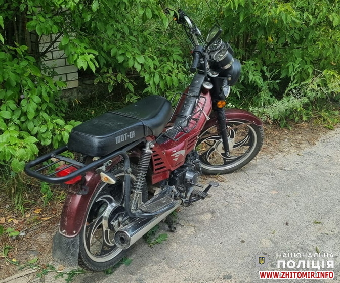 24 липня у с. Корчаку працівники групи реагування патрульної поліції ВП № 1 Житомирського райуправління зупинили мотоцикл «Mustang»: керманич рухався без шолому на незареєстрованому двоколісному транспортному засобі.
