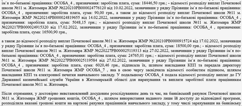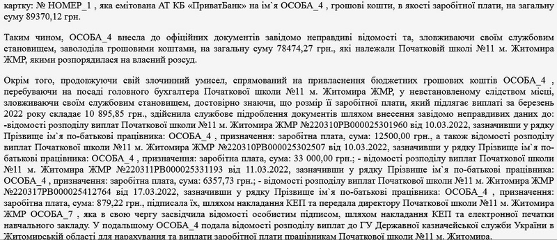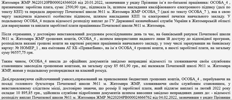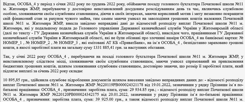 Як повідомляв Житомир.info, в квітні 2023 року 24-річній головній бухгалтерці початкової школи Житомира повідомили про підозру у заволодінні чужим майном шляхом зловживання службовим становищем, вчиненому в особливо великих розмірах, та у внесенні завідомо неправдивих відомостей до офіційних документів (ч. 5 ст. 191, ч. 1 ст. 366 КК України): за висновками судової економічної експертизи, фігурантка справи заволоділа понад 1,3 млн грн бюджетних коштів.