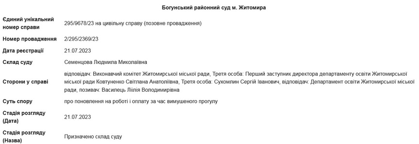Богунський районний суд м.Житомира 21 липня почав розгляд справи за позовом Лідії Василець до виконавчого комітету Житомирської міської ради та департаменту освіти щодо поновлення на роботі і оплату за час вимушеного прогулу.