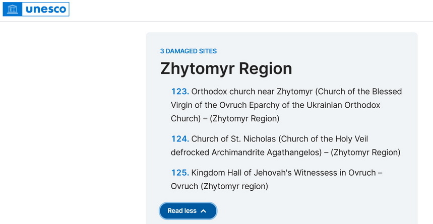 «Станом на 26 липня 2023 року ЮНЕСКО підтвердила пошкодження з 24 лютого 2022 року 274 об'єктів – 117 релігійних об'єктів, 27 музеїв, 98 будівель, що мають історичну та/або мистецьку цінність, 19 пам'ятників, 12 бібліотек, 1 архів», - йдеться у повідомленні.