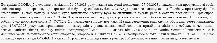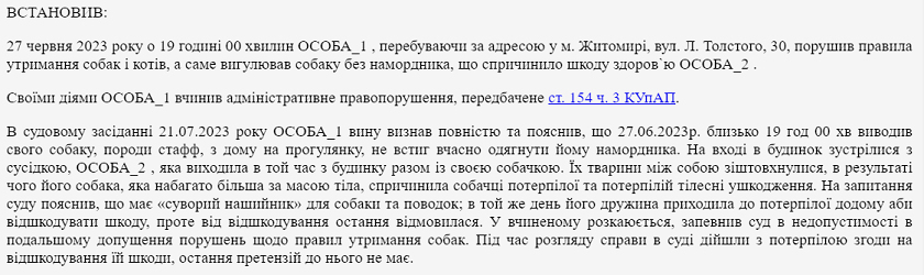 «В судовому засіданні 21.07.2023 року ОСОБА_1 вину визнав повністю та пояснив, що 27.06.2023р. близько 19 год 00 хв виводив свого собаку, породи стафф, з дому на прогулянку, не встиг вчасно одягнути йому намордника. На вході в будинок зустрілися з сусідкою, ОСОБА_2, яка виходила в той час з будинку разом із своєю собачкою. Їх тварини між собою зіштовхнулися, в результаті чого його собака, яка набагато більша за масою тіла, спричинила собачці потерпілої та потерпілій тілесні ушкодження. На запитання суду пояснив, що має «суворий нашийник» для собаки та поводок; в той же день його дружина приходила до потерпілої додому, аби відшкодувати шкоду, проте від відшкодування остання відмовилася. У вчиненому розкаюється, запевнив суд в недопустимості в подальшому допущення порушень щодо правил утримання собак. Під час розгляду справи в суді дійшли з потерпілою згоди на відшкодування їй шкоди, остання претензій до нього не має», – йдеться у матеріалах суду.