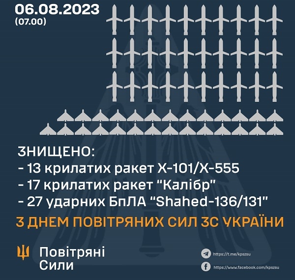 «Тож загалом за кілька хвиль атак з вечора 5-го по ранок 6-го серпня 2023 року противник застосував 70 засобів повітряного нападу. Протиповітряною обороною знищено: 17 крилатих ракет «Калібр»; 13 крилатих ракет Х-101/Х-555; 27 ударних БпЛА «Shahed-136/131». Тримаймо небо! Разом – до перемоги!», – підсумовують у Повітряних силах.
