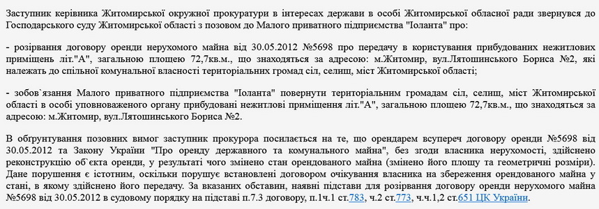 Заступника керівника Житомирської окружної прокуратури в інтересах держави в особі Житомирської обласної ради подав позов до Малого приватного підприємства «Іоланта» про розірвання договору оренди та зобов’язання повернути нерухоме майно в центрі Житомира.