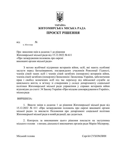 В департаменті соціальної політики Житомирської міської ради з’явиться нове управління у справах ветеранів війни.