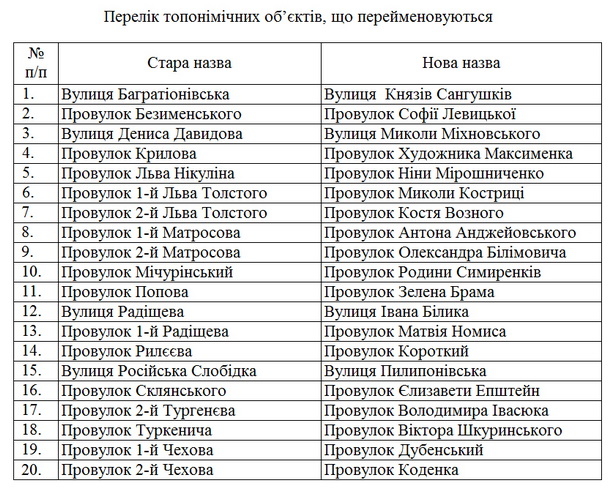 Нижче – додаток до проєкту рішення сесії з новими назвами: