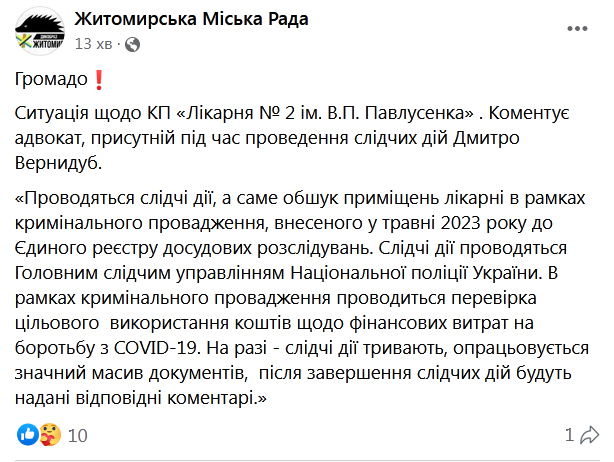 «Проводяться слідчі дії, а саме обшук приміщень лікарні в рамках кримінального провадження, внесеного у травні 2023 року до Єдиного реєстру досудових розслідувань. Слідчі дії проводяться Головним слідчим управлінням Національної поліції України. В рамках кримінального провадження проводиться перевірка цільового використання коштів щодо фінансових витрат на боротьбу з COVID-19. На разі – слідчі дії тривають, опрацьовується значний масив документів, після завершення слідчих дій будуть надані відповідні коментарі», - повідомив адвокат.