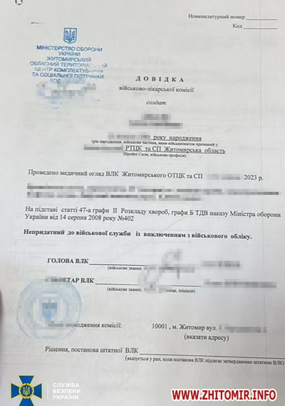 Як повідомляв Житомир.info, ввечері 1 серпня 2023 року пресслужба Офісу генерального прокурора інформувала про досудове розслідування у кримінальному провадженні за фактами організації ухилення від призову на військову службу під час мобілізації, в рамках якого було проведено майже 100 обшуків у військкоматах 11 областей, зокрема, йшлося і про Житомирську. Однак 2 серпня заступник начальника – начальник сектору комплектування Житомирського обласного територіального центру комплектування та соціальної підтримки Олексій Бєланов розповів, що правоохоронці дійсно викрили схему видачі громадянам фальсифікованих довідок про непридатність до військової служби для подальшого перетину кордону, але в Житомирських ТЦК та СП обшуків з цього приводу не було. Йшлося про Білгород-Дністровський РТЦК та СП: там, так звані, «ухилянти» протягом 1-2 днів ставали на облік в Білгород-Дністровському РТЦК та СП, проходили військово-лікарську комісію та за її результатами були визнані непридатними до військової служби і виключені з військового обліку за станом здоров’я.