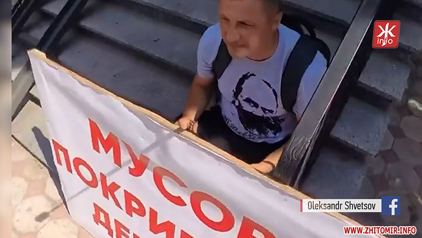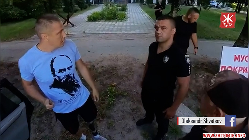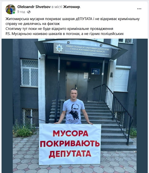 Вранці 17 серпня відомий житомирський волонтер Олександр Швецов влаштував пікет біля відділу №1 Житомирського райуправління поліції.