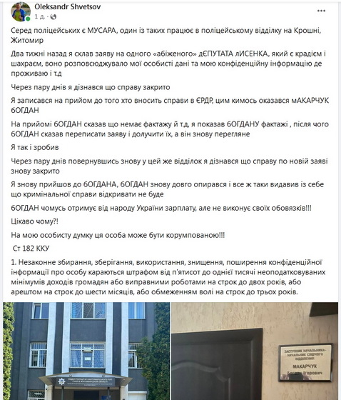 Напередодні, вдень 16 серпня Олександр Швецов оприлюднив допис про те, що в Житомирському райвідділі поліції не хочуть реєструвати кримінальне провадження за заявами про розголошення персональних даних, і особиста зустріч з начальником слідчого відділення Богданом Макарчуком нічого не змінила.