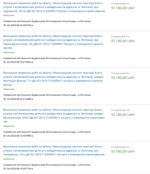 14-15 серпня були підписані п’ять договорів на 275 тис. 900 грн (по 55 тис. 180 грн кожен) на виконання проектних робіт для реконструкції частини території благоустрою з встановленням дитячих майданчиків за адресами: вул. Покровська, 131; майдан Путятинський, 9/50; майдан Мистецькі Ворота, 11; вул. Героїв Десантників, 15; вул. Чуднівська, 101-а. Три договори уклали з ТОВ «Архітектура Плюс Дизайн», два – з ФОП Голенков Олег Олександрович.