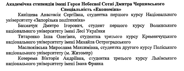 Про це йдеться в наказі Міністерства освіти та науки № 1005 від 17 серпня 2023 року «Про призначення академічних стипендій імені Героїв Небесної на 2023/2024 навчальний рік», оприлюдненому на сайті МОН.