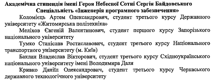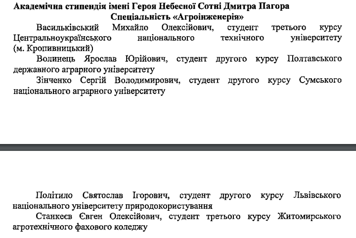 Нагадаємо, від 10 серпня 2020 року в Україні академічні стипендії імені Героїв Небесної Сотні на навчальний 2020/2021 рік отримуватимуть 43 студенти та курсанти за 10 спеціальностями, серед який студент Житомирського агротехколеджу.