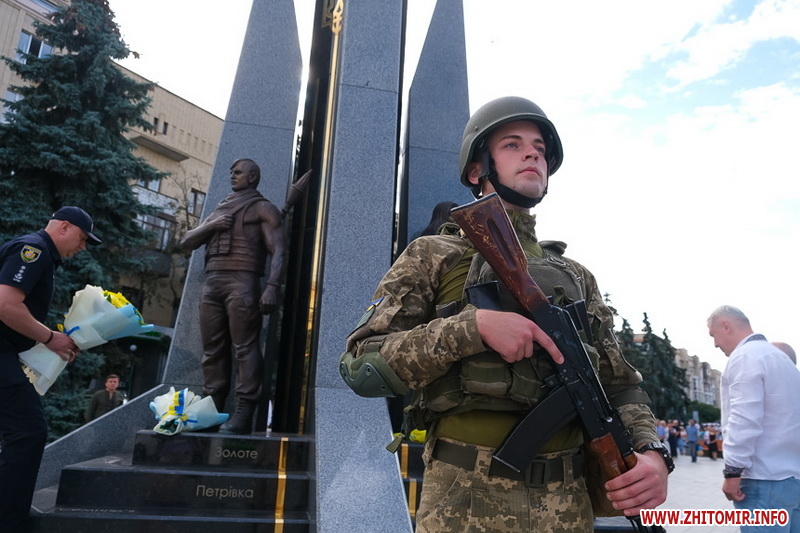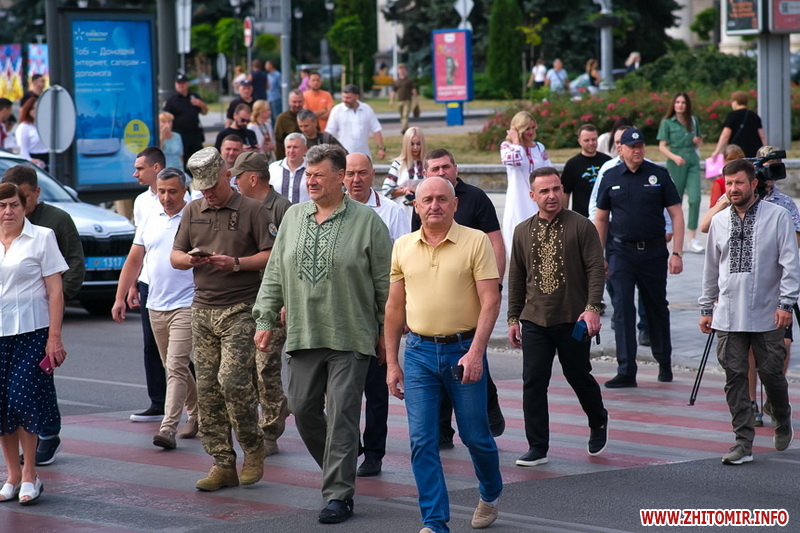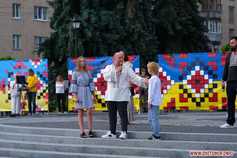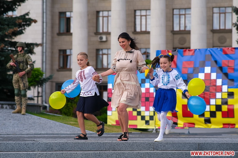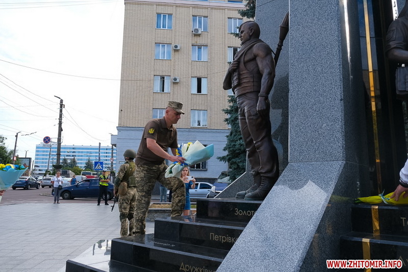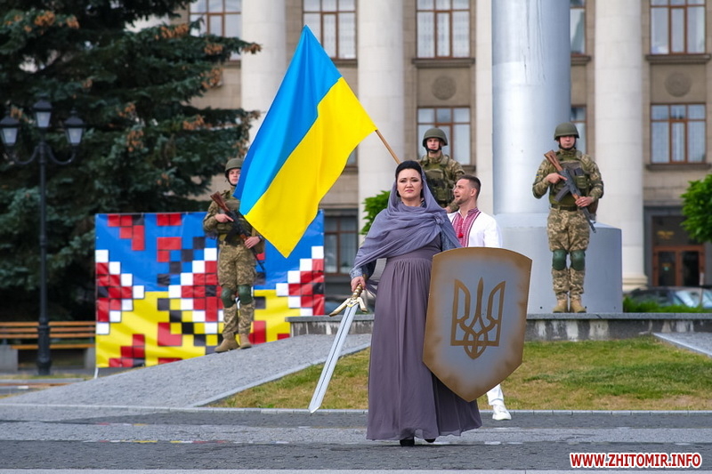 Актори Житомирського академічного українського музично-драматичного театру ім. І.Кочерги та дитячої студії “Візаві” підготували для житомирян театралізоване вітання, а завершився захід покладанням квітів до пам’ятного знака “Захисникам України у війні з російським агресором” та меморіальних стендів загиблих захисників України.
