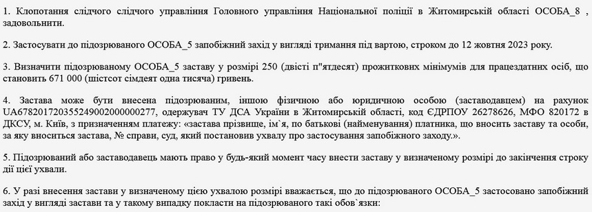 Всім трьом підозрюваним був обраний однаковий запобіжний захід – тримання під вартою строком до 12 жовтня 2023 року з правом внесення застави у розмірі 250 прожиткових мінімумів для працездатних осіб, що становить 671 тис. грн.