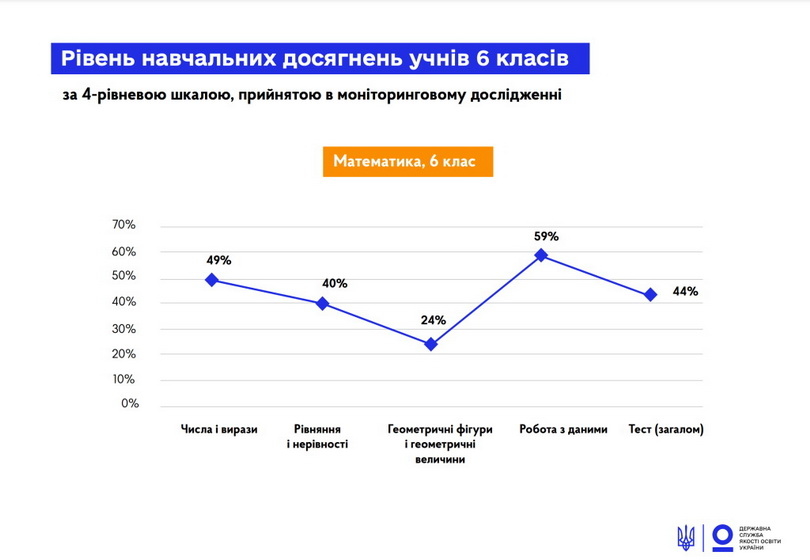 Завдання стосувалися тем, які учні вивчали у 5 та 6 класах. Найскладніше учням далися завдання про геометричні фігури й величини. Ці теми якраз вивчалися наприкінці 4-го класу, коли діти через пандемію перейшли на дистанційне навчання. Найкраще впоралися шестикласники із завданнями, які стосувалися роботи з даними.