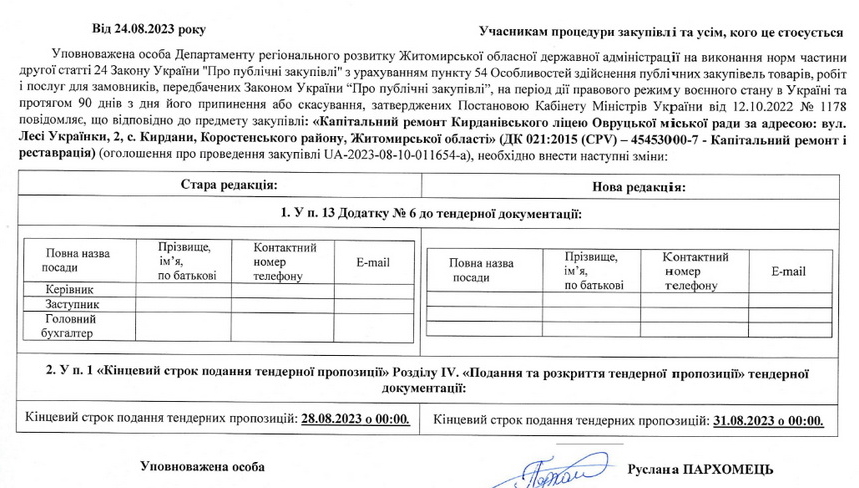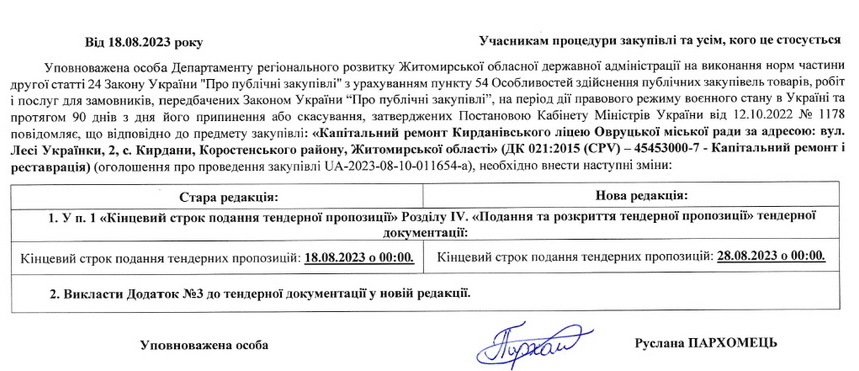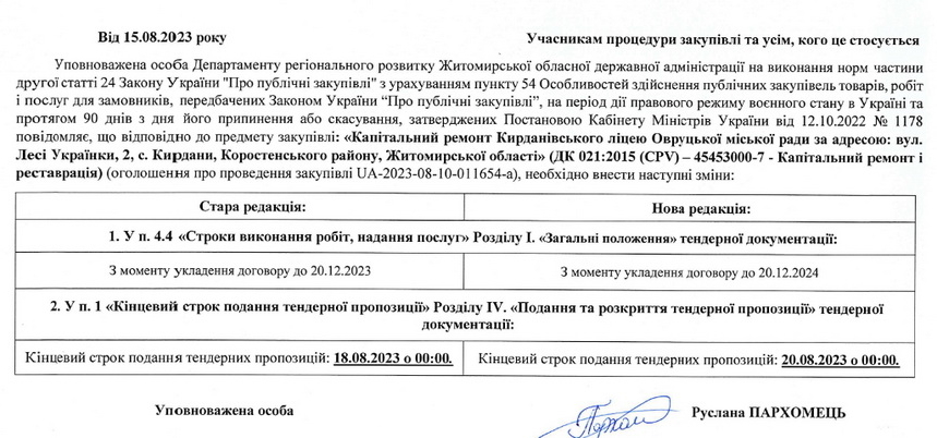15 серпня в тендерну документацію внесли зміни: аукціон перенесли на 20 серпня, а строк виконання робіт визначили до 20 грудня 2024 року.