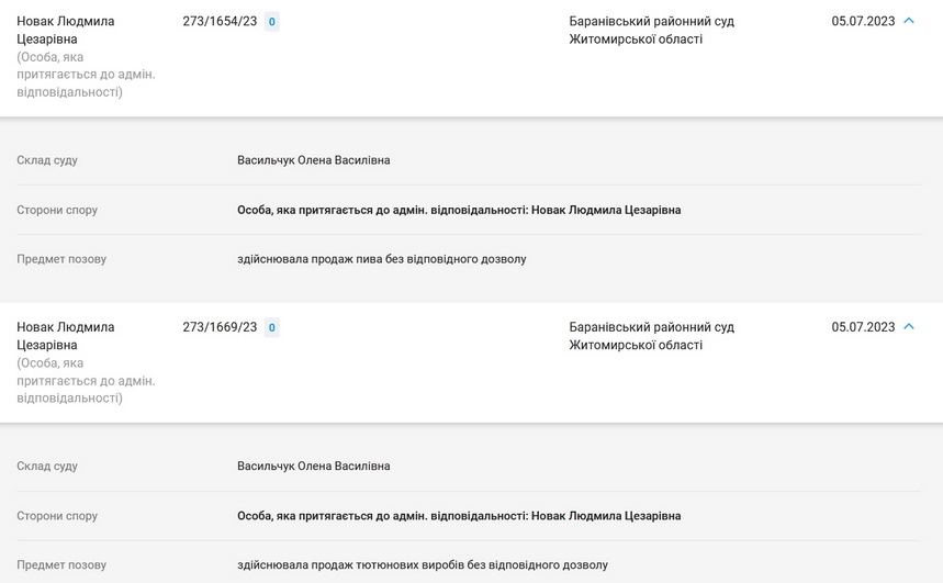 За інформацією аналітичного порталу Youcontrol, в на розгляді Баранівському районному суді з липня 2023 року перебувають дві справи про адміністративні правопорушення Людмили Новак щодо продажу пива та тютюнових виробів без відповідного дозволу.