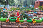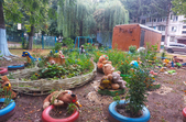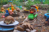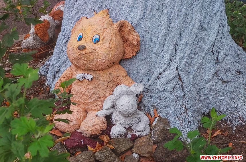 Сьогодні, 31 серпня, в об'єктив нашого фотографа потрапив один з двориків мікрорайону Крошня. Тут дбайливо зібрані м'які іграшки усіх форм та розмірів. Найбільші іграшки прив'язані до дерев дротом, деякі залиті фарбою, що перетворило їх на скульптури.