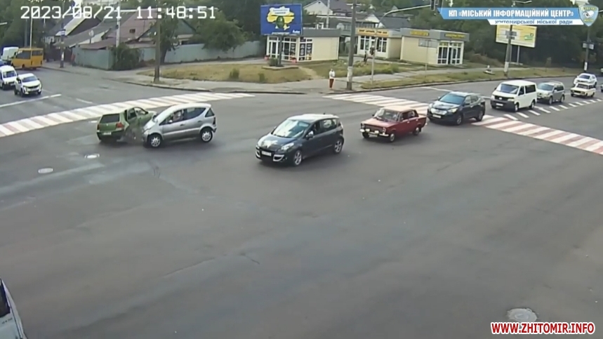 Нагадаємо, 25 серпня у Житомирі, на перехресті вулиць Київської та Східної, сталася ДТП без потерпілих за участю двох автомобілів: зіткнулися Renault та Volkswagen.