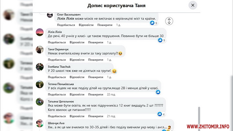 Батьки житомирських школярів занепокоєні, що класи, де більше ніж 28 учнів, не поділяють на підгрупи для вивчення англійської мови та інших предметів.