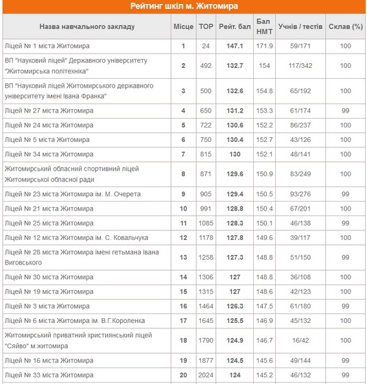 Рейтинг шкіл Житомира за підсумками НМТ 2023 року 5 вересня оприлюднив сайт Освіта.ua.