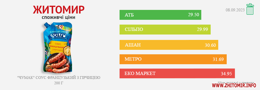 Моніторинг здійснено на основі інформації, отриманої за методом контрольної закупки 08.09.2023 р. у місцях продажу: АТБ, пр. Миру, 15 А, Ашан, вул. Київська, 77, Метро, вул. Ватутіна, 55-в, Сільпо, пл. Житній ринок, 1, Еко Маркет, вул. М. Бердичівська, 2/7