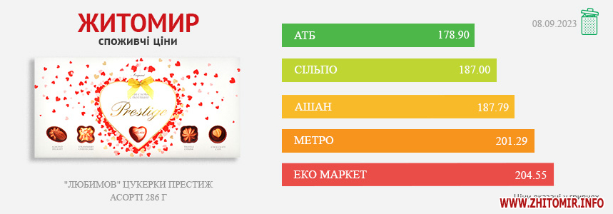 Моніторинг здійснено на основі інформації, отриманої за методом контрольної закупки 08.09.2023 р. у місцях продажу: АТБ, пр. Миру, 15 А, Ашан, вул. Київська, 77, Метро, вул. Ватутіна, 55-в, Сільпо, пл. Житній ринок, 1, Еко Маркет, вул. М. Бердичівська, 2/7
